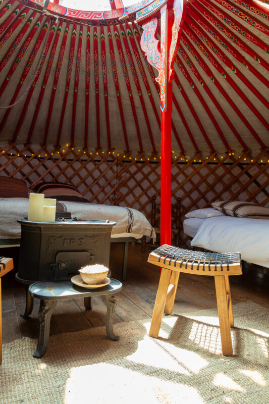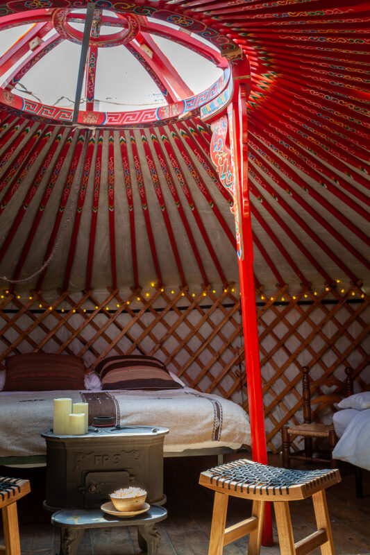 La tenda Yurta è una tenda in canvas bianco della tradizione dei popoli nomadi del deserto del Gobi, di 25 mq, allestita in stile etnico con un letto matrimoniale e due letti singoli, con piumini invernali e biancheria da letto e da bagno per tutti, oltre a una piccola stufa per migliorare il comfort.