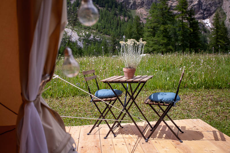 E’ dotata di tappeti e lampade a pannelli solari ma anche di allaccio alla corrente (fino a 2 ampere), avrete a vostra disposizione un tavolo con sedie e puff o sdraio per rilassarvi.