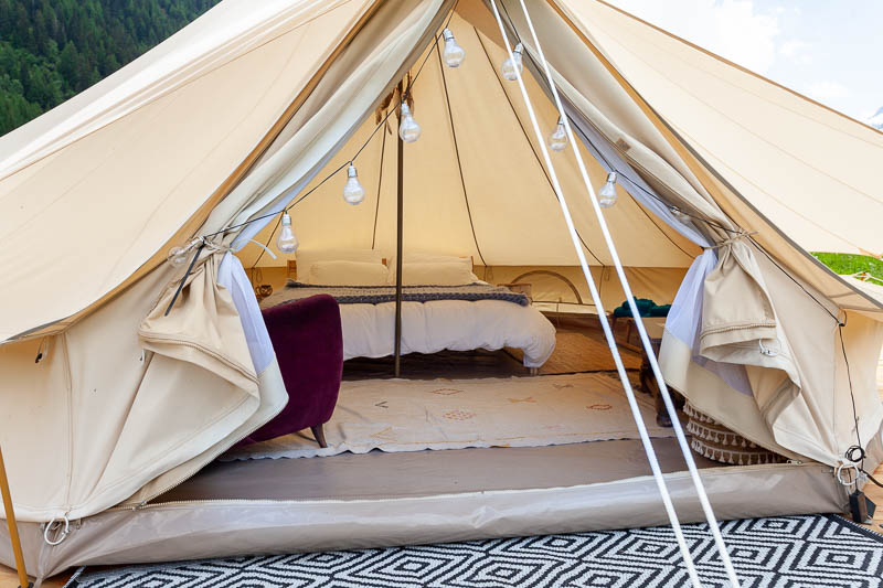 La tenda è una tenda in canvas Sibley di 20 mq, allestita in stile moderno con un letto matrimoniale, con piumini invernali e biancheria da letto e da bagno per tutti; oltre a una piccola stufa per migliorare il comfort.