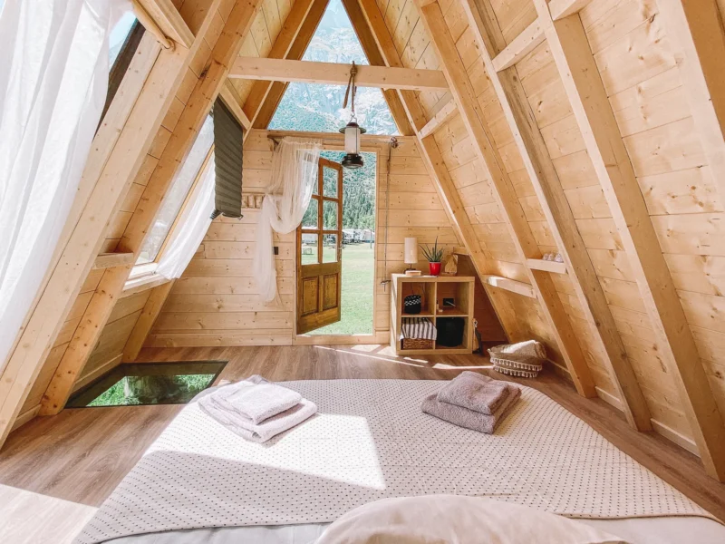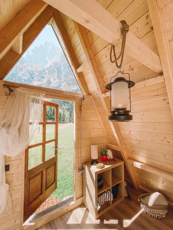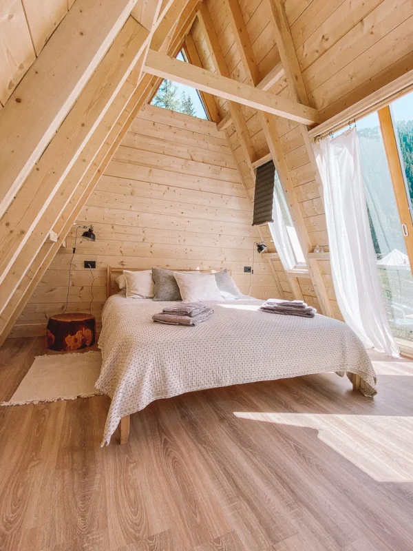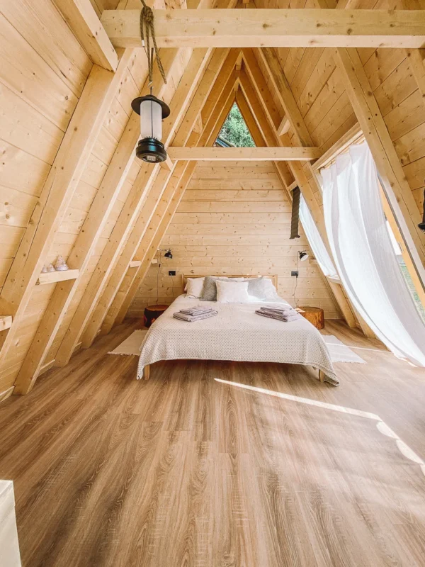 Woody è una tenda in legno di 25 mq, allestita in stile essenziale e naturale con un letto matrimoniale, con piumini invernali e biancheria da letto e da bagno per tutti.